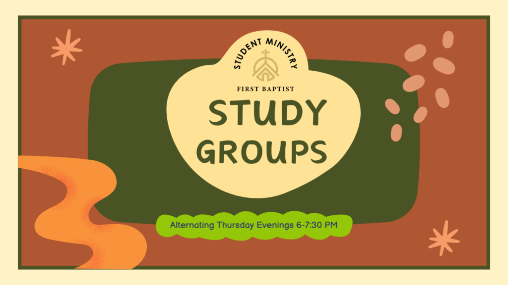 Student Ministry Fall Study Groups! Every other Thursday from 6 to 7:30. Starting Thursday, October 9th. Open to all middle school and high schoolers. Meet at the Youth Ministry Center.